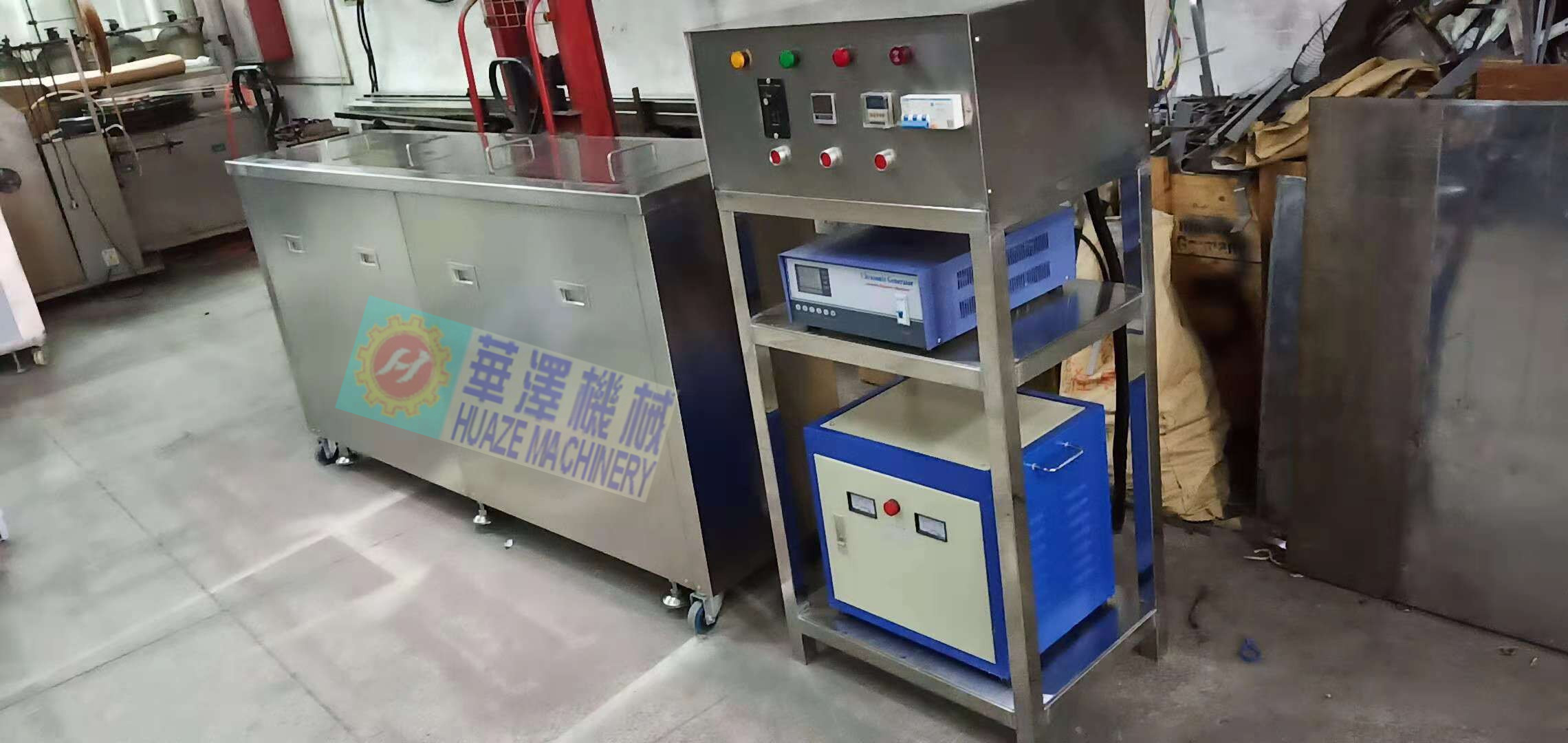 毛刷輥超聲波清洗機的最基本組成是:超聲波發(fā)生器,換能器和清洗水槽、轉(zhuǎn)動機構(gòu)。首先,超聲波發(fā)生器將交流電源轉(zhuǎn)換成超聲波頻率的電源,然后通過電纜把電源輸送給換能器,換能器往往由若干個聲頭并聯(lián)組合為聲陣而成,在這里電能被轉(zhuǎn)換為同頻機械振動能,傳遞到清洗水槽中,使清洗液中形成來回振動的超聲波聲場。在超聲波聲場中,振動負(fù)壓區(qū)由于周圍的液體來不及補充,形成無數(shù)的微小真空泡,而當(dāng)正壓來到時,微小氣泡在壓力下突然爆破,液體間猛烈碰撞產(chǎn)生極大的沖擊波,可以形成幾千到上萬的大氣壓以及瞬時上百度的高溫,這就是 超聲波的“空化”作用。 空化作用具有非常優(yōu)良的清洗和乳化作用,使油污脫離清洗工件的表面,從而達(dá)到了快速,干凈的清洗目的